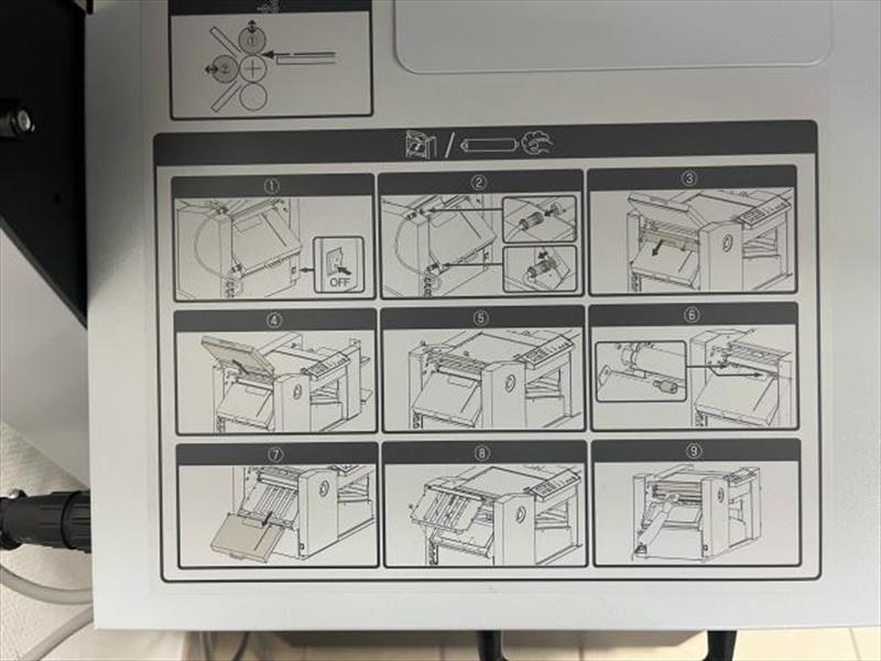 - Control panel with digital display for accessing various functions - 24 standard folds stored in memory: single fold, accordion fold, mail fold, and roll fold (6 fold types x 4 standard formats) - Other folds possible with manual adjustment - Memory for specific jobs - Convenient and practical: squareness adjustment, 4-digit up/down counter, automatic shutoff in case of paper shortage, jam, etc. - In the event of a pocket jam, it opens easily without having to remove it from the machine -